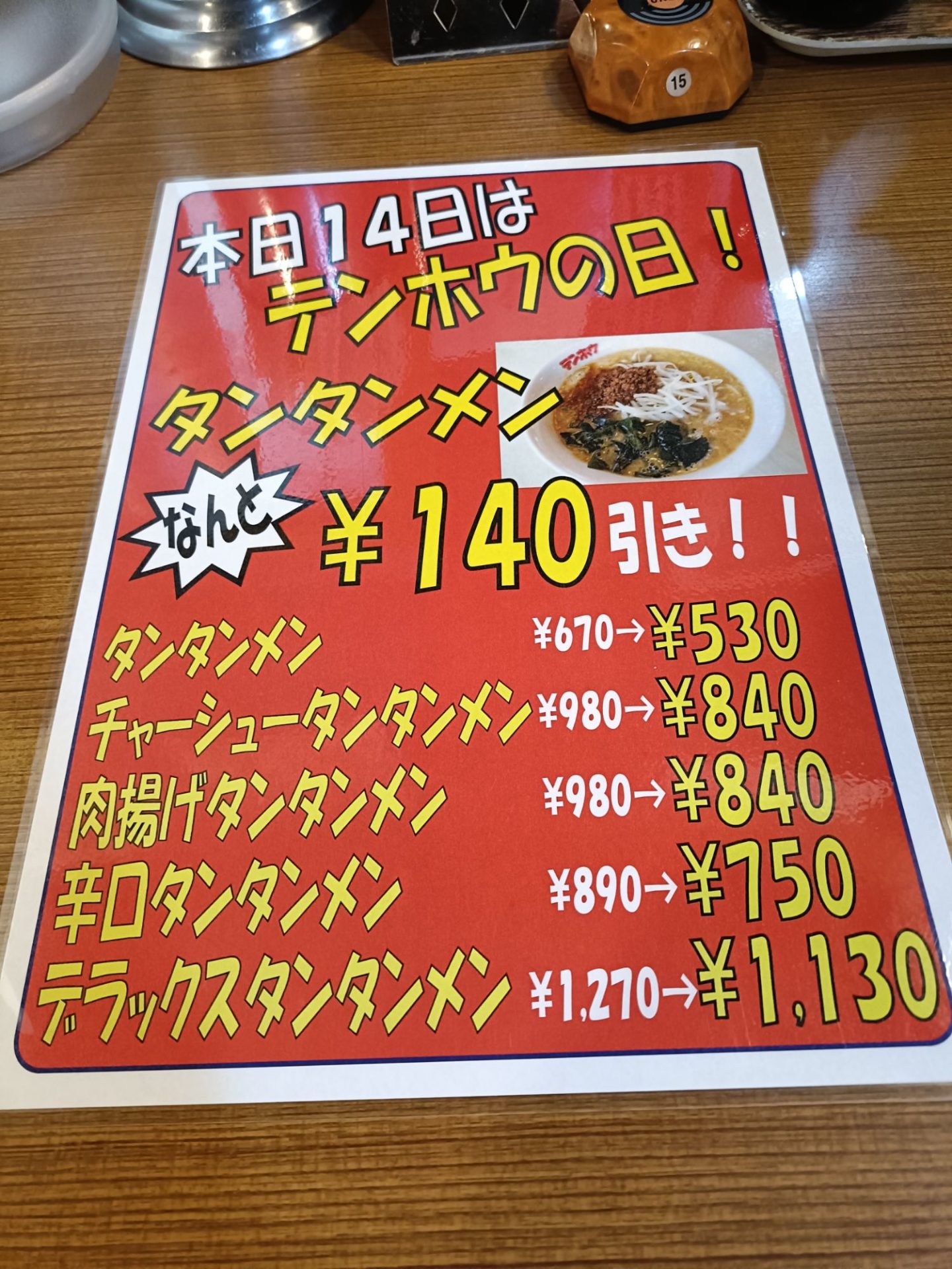 店内の掲示板には、食欲をそそる赤い告知が。本日14日は、看板メニューのタンタン麺シリーズが全品140円引きになるんです!