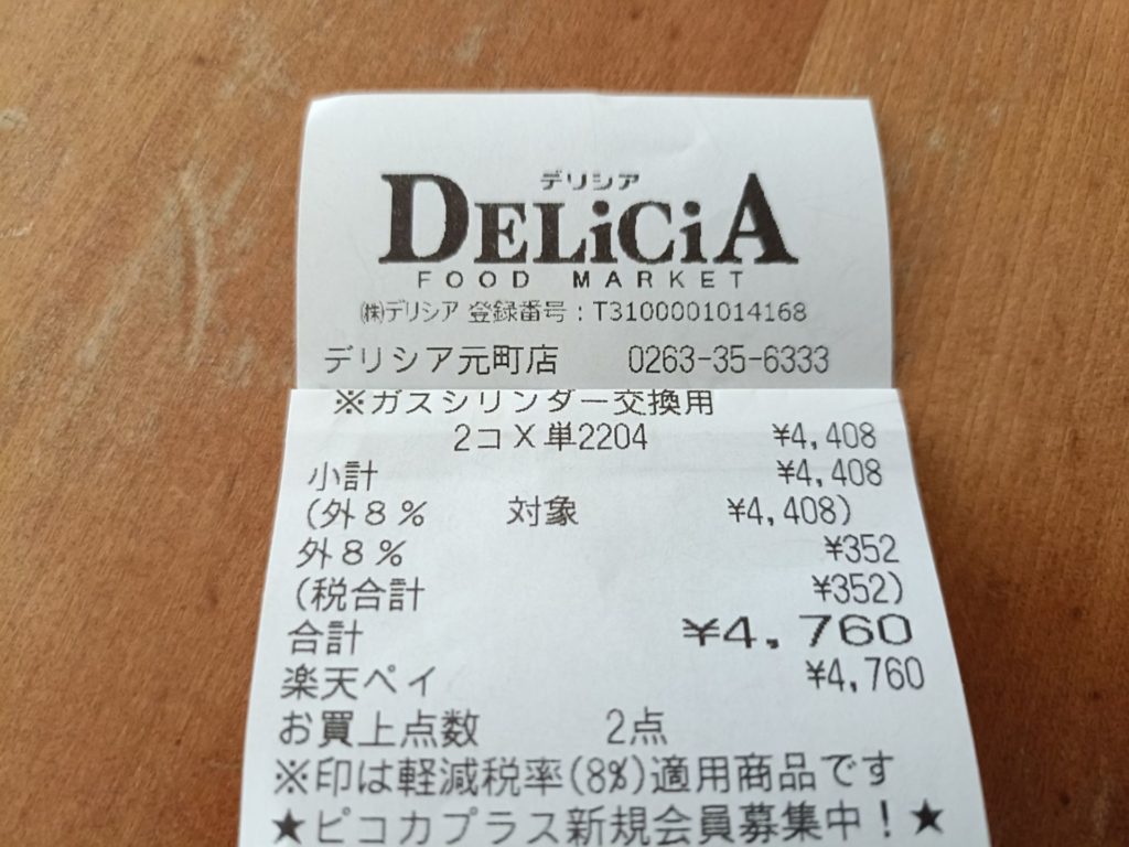レシートによると、交換ガスシリンダーは1本あたり税抜2,204円。2本で4,408円(税抜)でした。