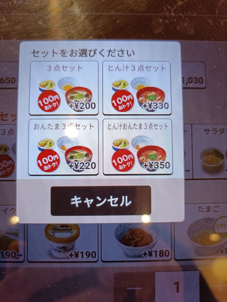 今回注文したのは、すき家の定番「牛丼(並盛)」(450円)。そして、サイドメニューで何かお得なものはないかとタッチパネルを眺めていると…ありました!