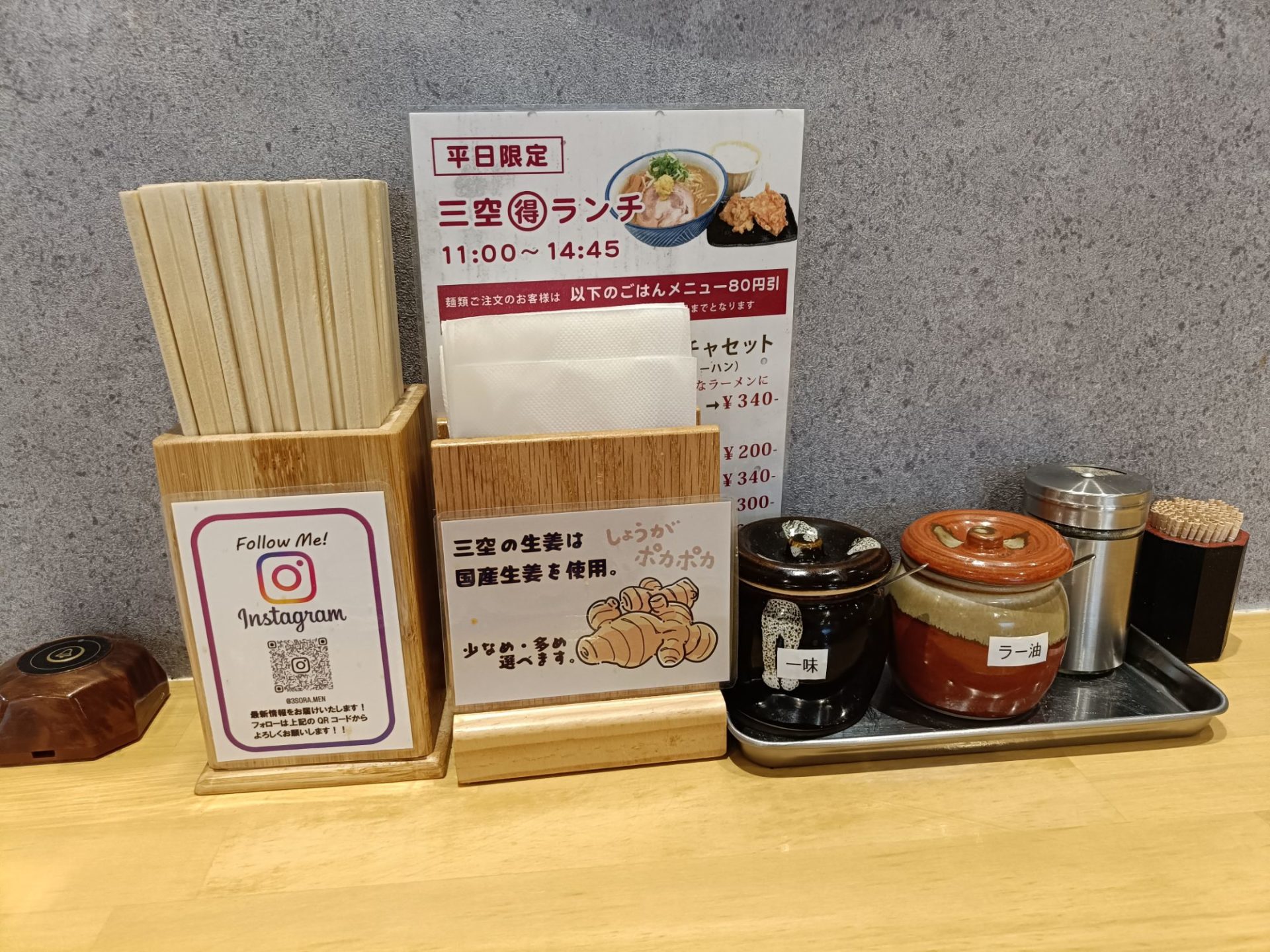 席に着くと、テーブルには「三空の生姜は国産生姜を使用」というポップが。