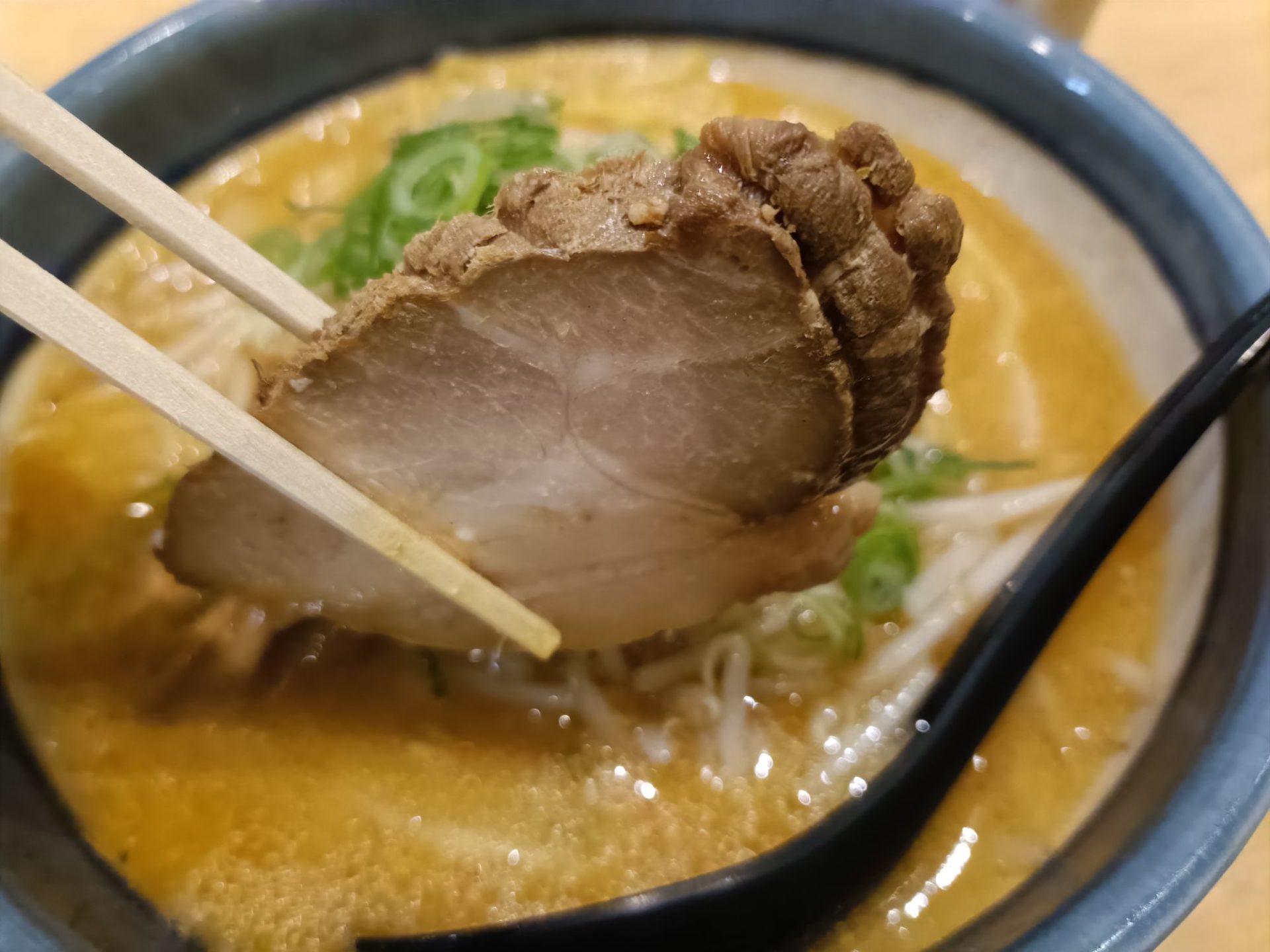 見た目からして濃厚そうな黄金色の味噌スープ。中央には大きなチャーシュー、その上にはすりおろし生姜がちょこんと(いや、しっかり!)乗っています。炒めたもやしとネギの彩りも食欲をそそります。