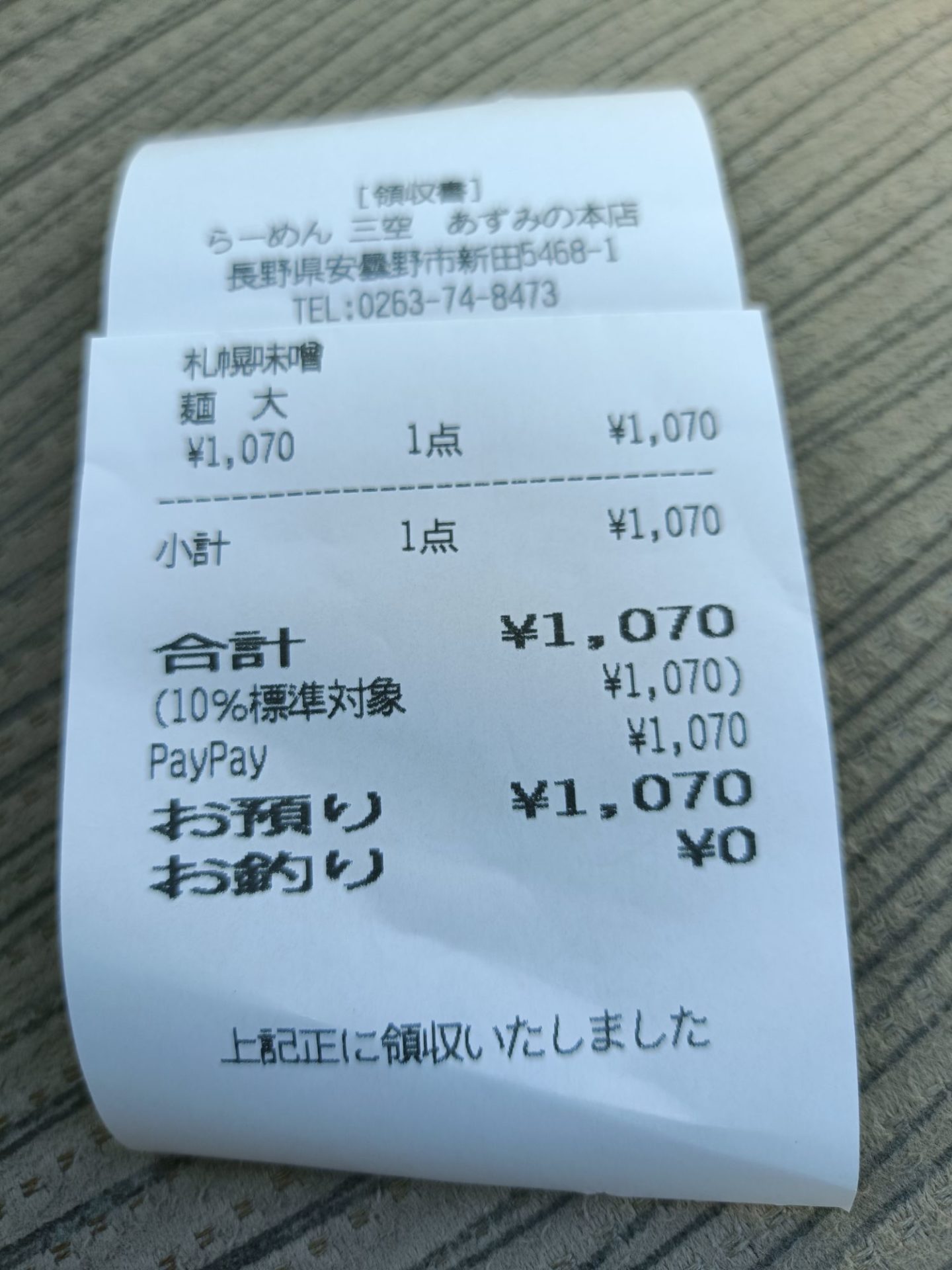 お会計は1,070円(税込)。PayPayも使えて便利でした。