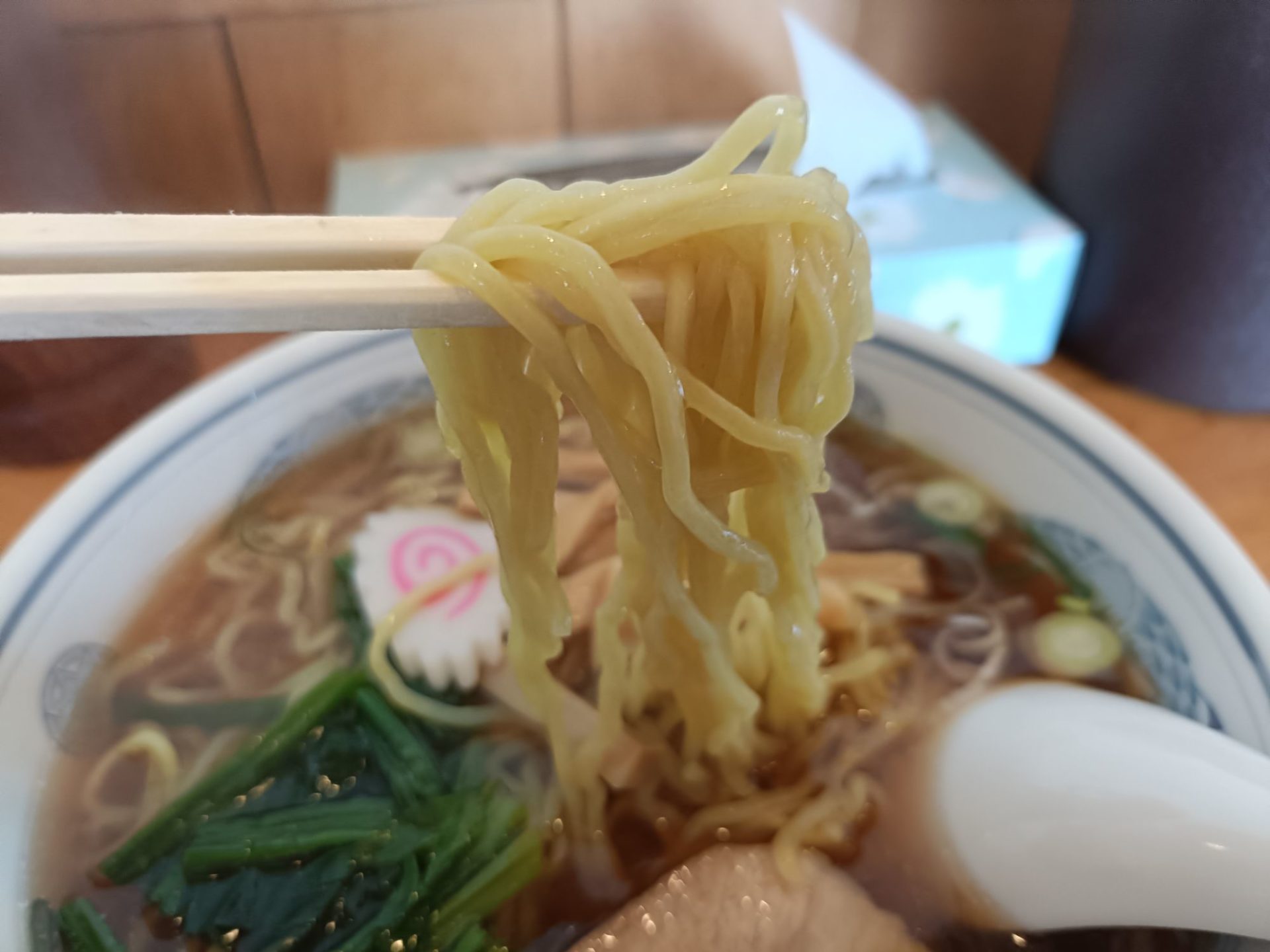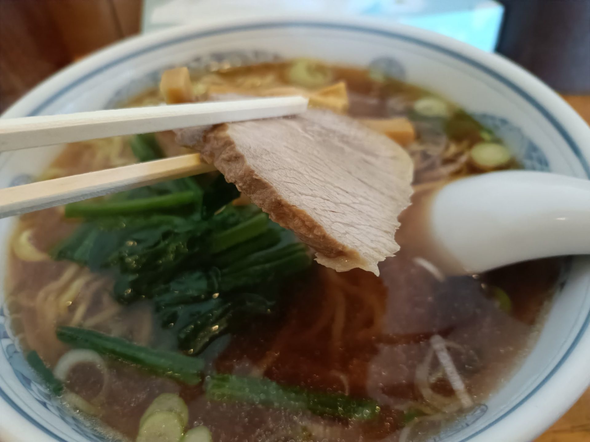まずはチャーシューから。お箸で持ち上げると、しっかりとした肉質が伝わってきます。脂身が少なめで、お肉本来の旨味をしっかり味わえるタイプ。スープの味が染みていて、噛むほどに幸せが広がります。
