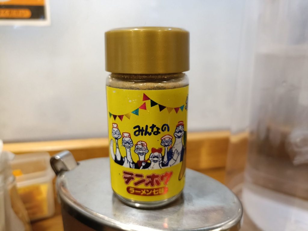 卓上にある、この八幡屋礒五郎とコラボの「ラーメン七味」。ピリッとした辛味と風味が、シンプルな醤油ラーメンによく合います。途中で少し加えることで、最後まで飽きることなく楽しめました。