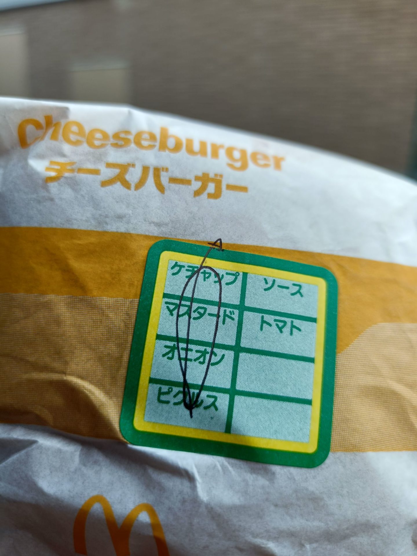 包み紙のステッカーにしっかりチェックが入っています。この「自分だけの特別仕様」感がたまりません。オニオンのシャキシャキ感とピクルスの酸味が増して、食べ応えが格段にアップしますよ。