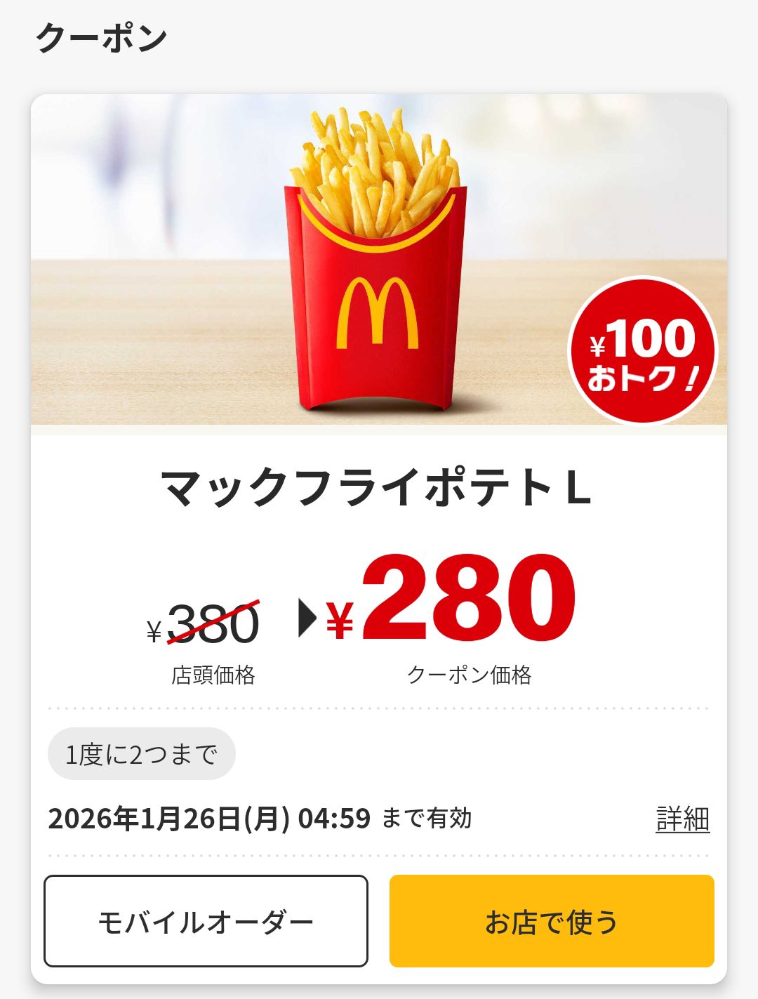 マックフライポテトL ¥380 → ¥280(100円おトク!)
