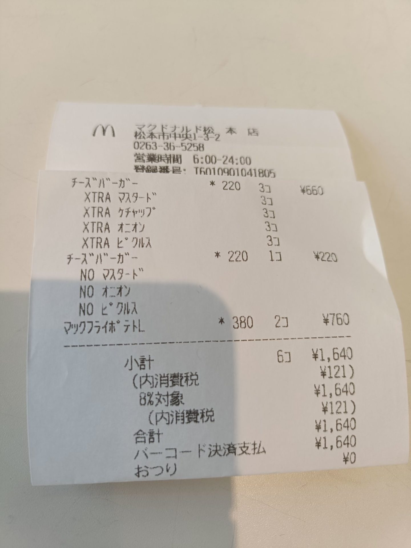 松本本店のマクドナルドで購入し、合計は1,640円でした。
