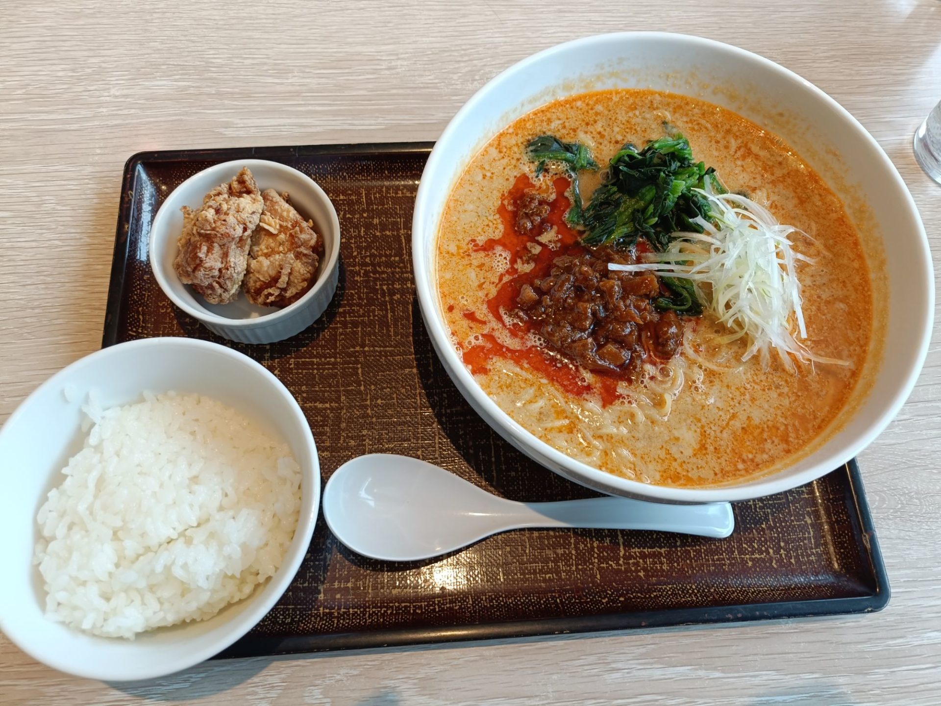 担々麺に鶏の唐揚げ2個とミニごはんがついた、わんぱくセットです(笑)。