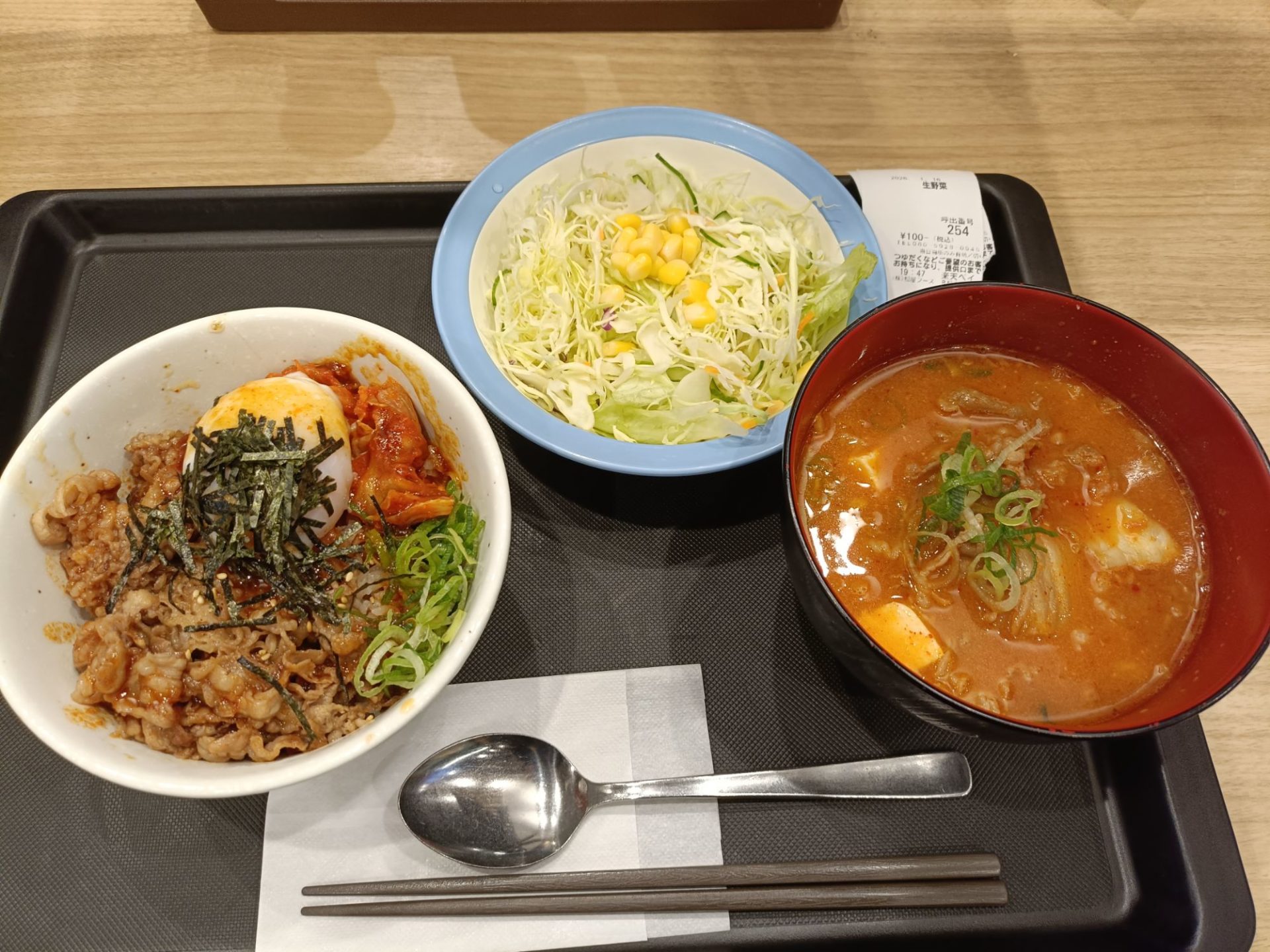 まずはスープを一口。ピリッとした辛さと魚介の出汁が、冷え切った身体の芯をじわじわと温めてくれる。豆腐のなめらかな食感が、疲れた胃に優しい。続いて、温玉を崩してキムチと一緒に牛丼を掻き込む。甘辛い肉の旨味と、キムチの酸味、そして卵のまろやかさが口の中で混ざり合う瞬間――。
