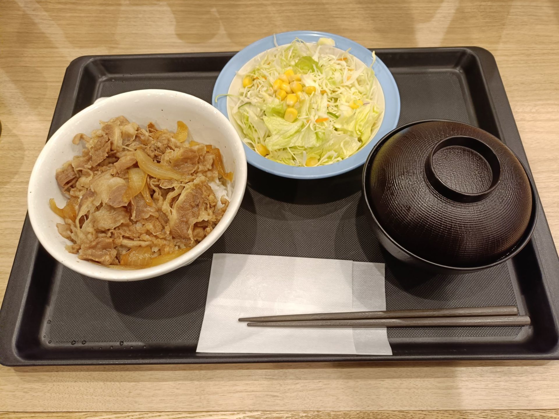 妻は牛丼とサラダのセットをニコニコと美味しそうに食べていた。